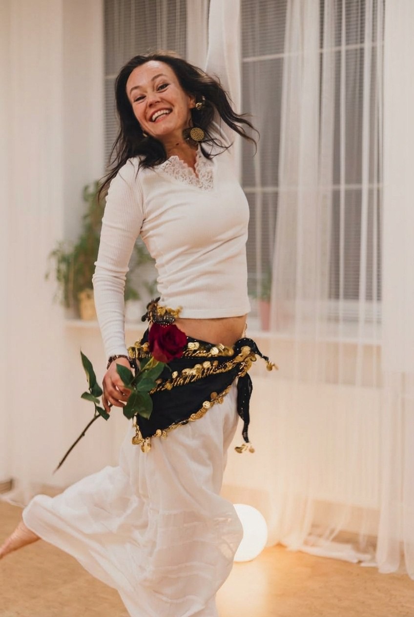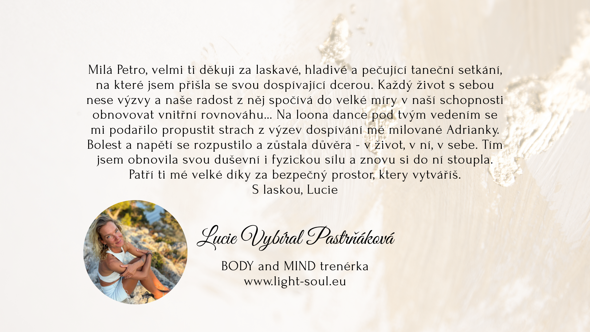 Jsem vděčná sama sobě, že jsem to překonala a vím, že to zvládneš i TY. Na mých tanečních večerech držím a ctím bezpečný prostor bez hodnocení, posuzování, pomluv, hašteření. Žádné škatulky, jen skutečně podporující ženské prostředí, kde se můžeš uvolnit do své opravdovosti a jedinečnosti. Díky tomu můžeš pustit kontrolu, uvolnit svoje tělo, mysl, emoce, svléknout všechny životní role a jen být, dýchat a tančit.