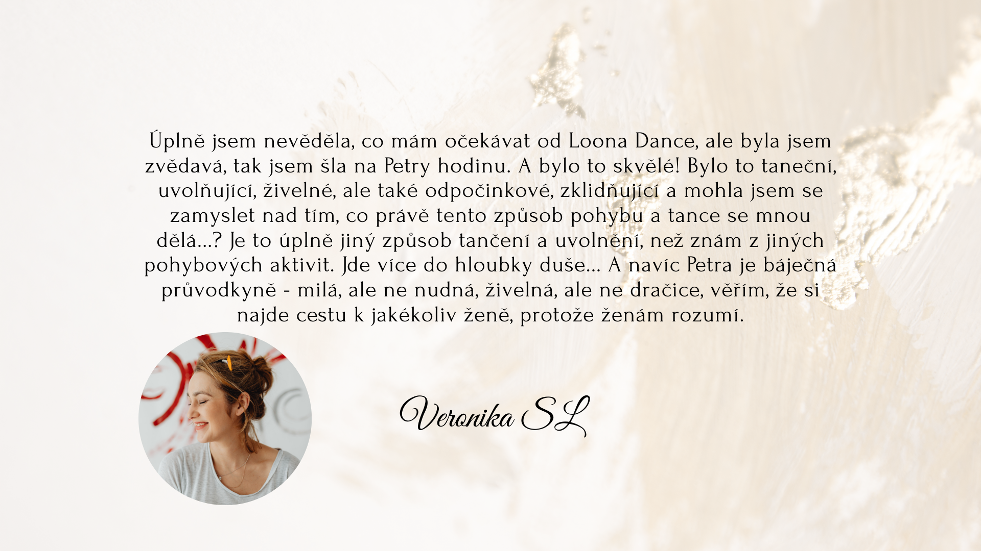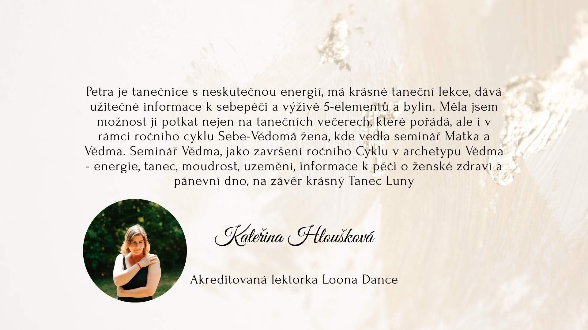 Jsem tanečnicí Loona Dance od roku 2012 a od roku 2023 jsem se stala akreditovanou lektorkou tohoto tanečního konceptu.