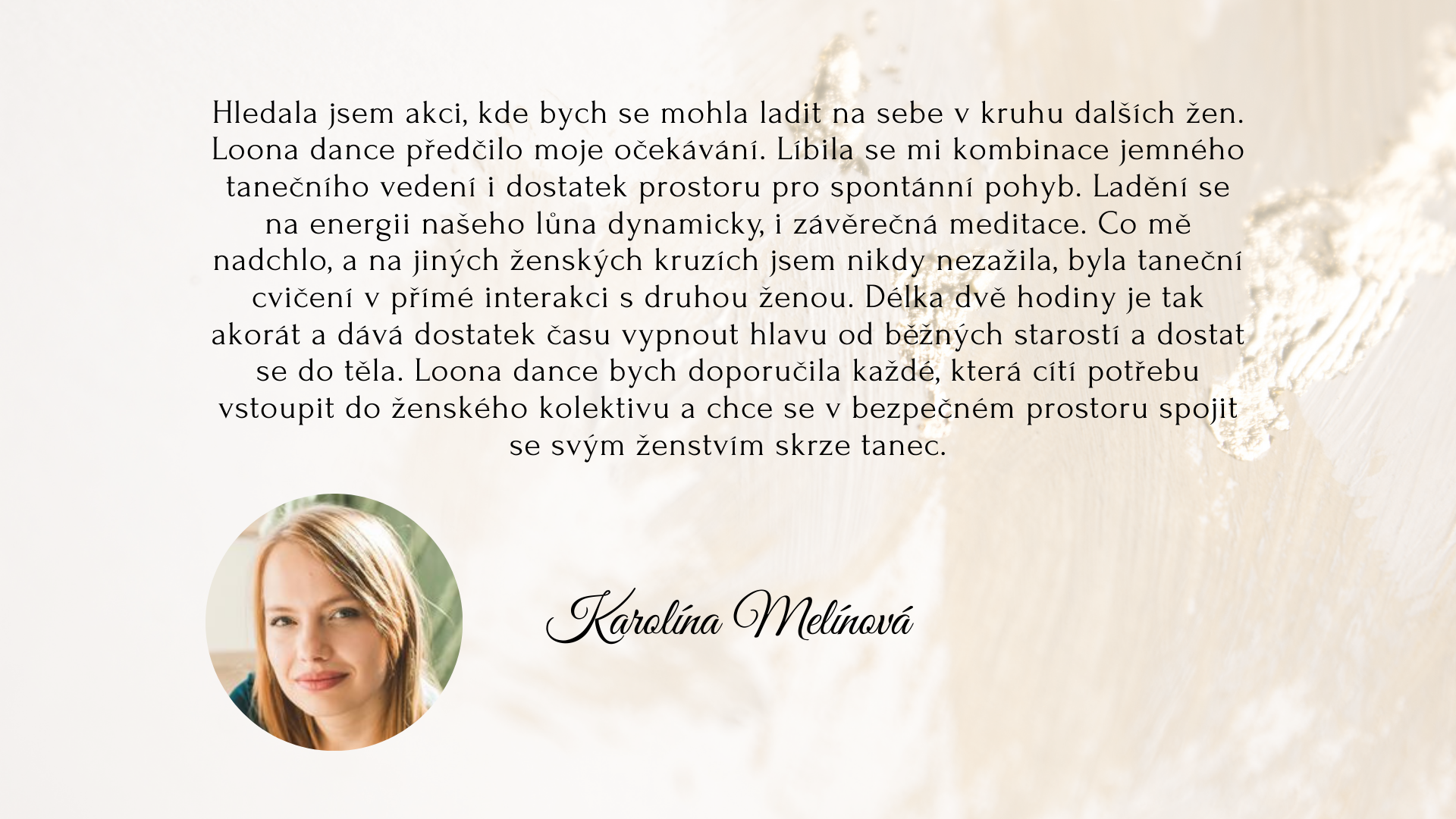 "Hudba a tanec jsou ženské vášně. Jsou to nástroje pro poznání vlastního nitra a pochopení se. Loona Dance Tě vede ještě dál, dokáže Ti zprostředkovat poznání, uvolnění a pochopení nejen sebe, ale i jiných žen. Vede Tě z hlavy do těla a tím přináší relaxaci, regeneraci, uvolnění a rovnováhu. Loona Dance je radostný, smyslný, očistný tanec, je to meditace tancem. Loona Dance pomáhá najít opravdovost, nedá se při něm lhát. Stačí jen být, tančit, dýchat, plynout. V jemnosti je největší síla."