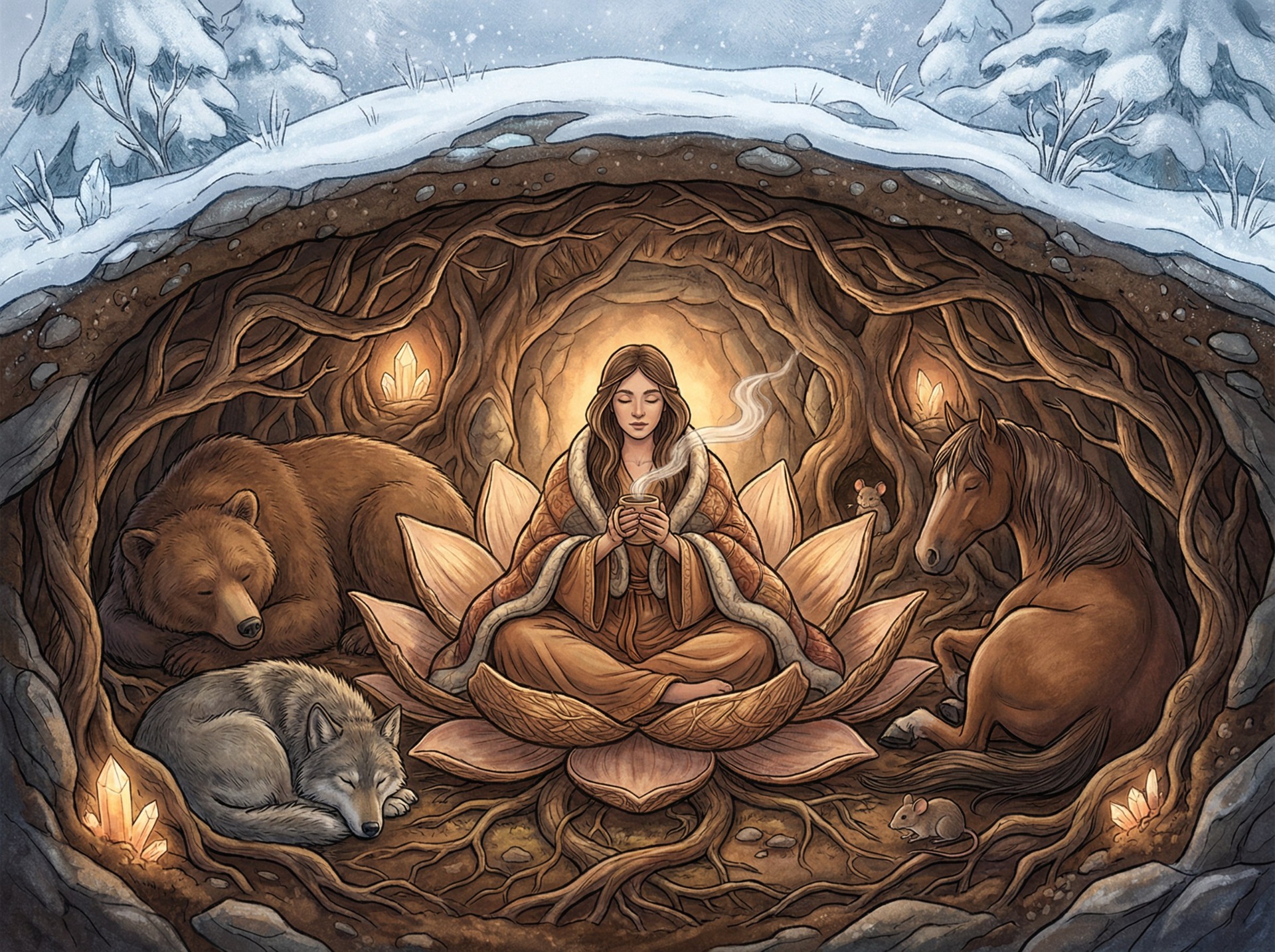 Představ si zvířata ukládající se k zimnímu spánku. Nedělají to napůl - nejprve se důkladně připraví, pak odpočívají a teprve, když proces dokončí, probouzí se plné síly. Stejně tak ženské tělo během menstruace potřebuje dokončit svůj cyklus obnovy.